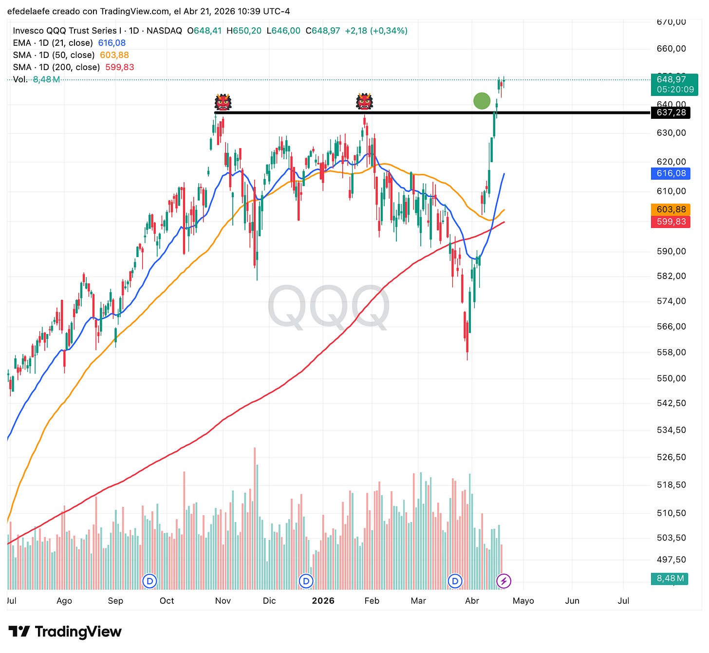 El QQQ rompió la semana pasada la resistencia en 637 que habÃa frenado dos rallies anteriores, y cerró el lunes con nuevos máximos históricos en 649.
