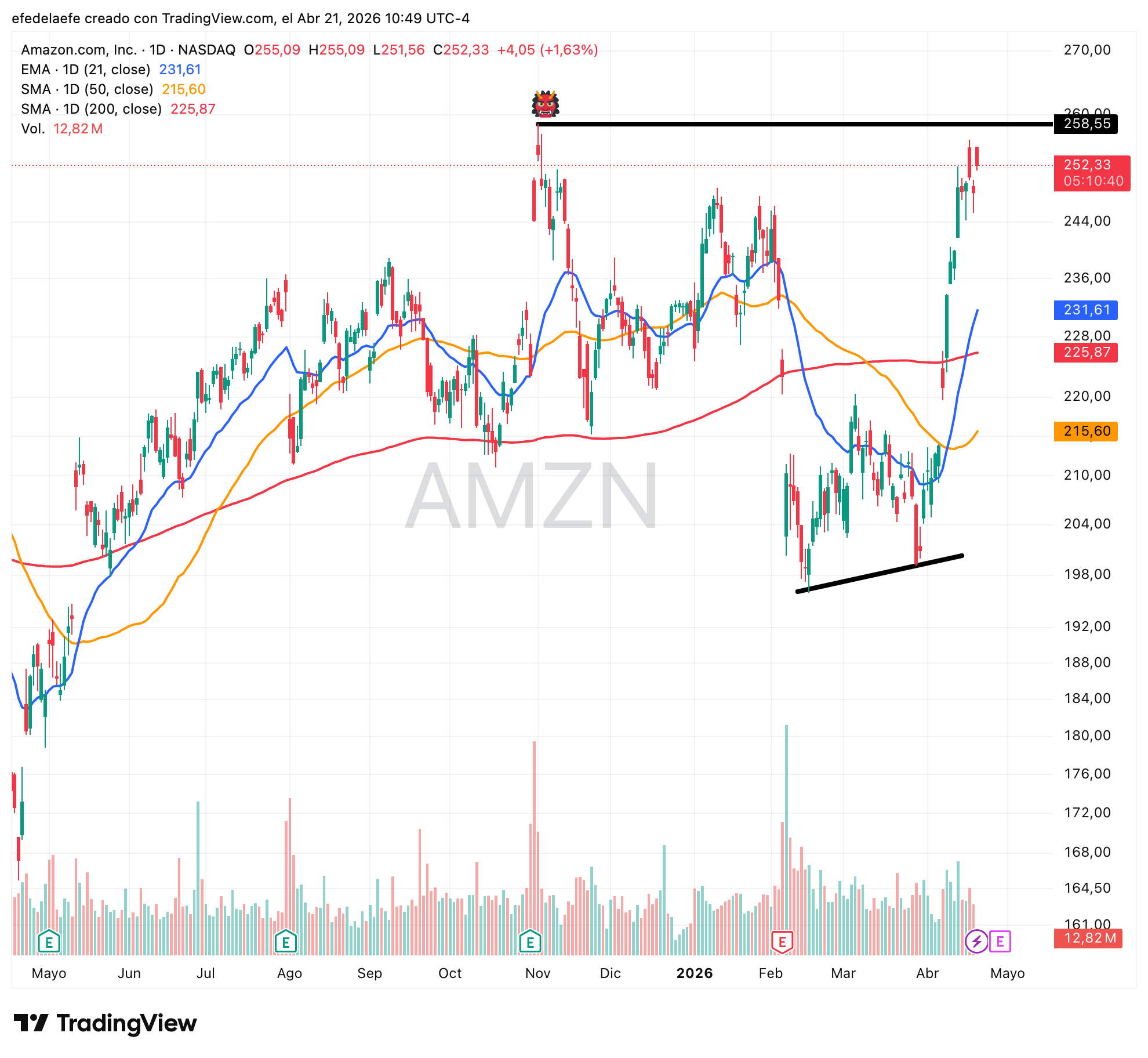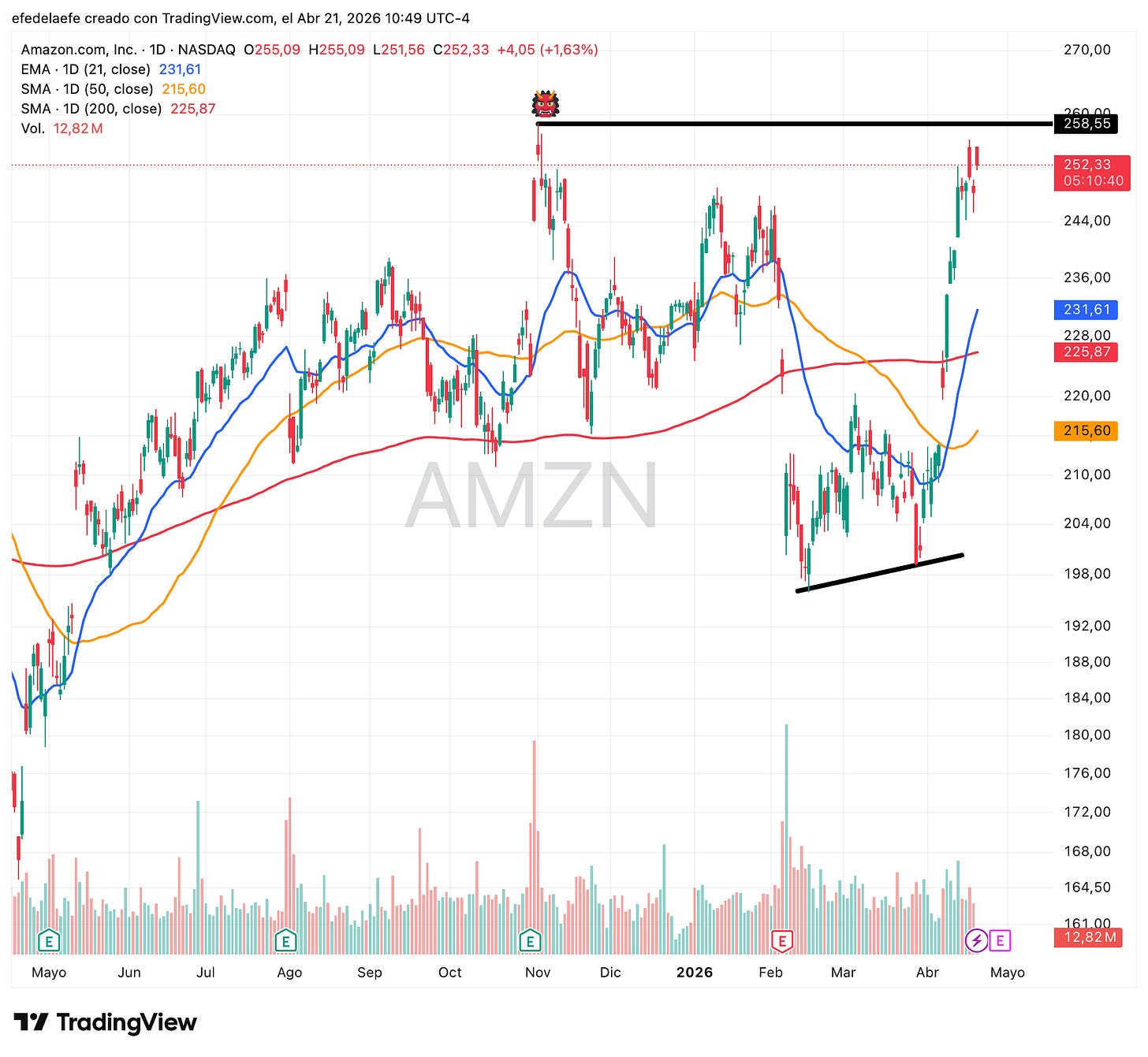 El gráfico de largo plazo es el más limpio de las MAG7 hasta ahora: una tendencia alcista intacta desde 2025, con la SMA200 subiendo con pendiente pronunciada. La corrección fue profunda pero no rompió nada estructural. 🟢