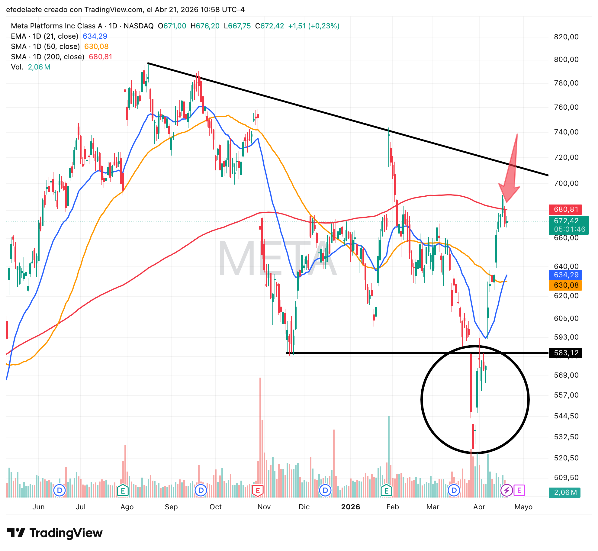 Desde los máximos de septiembre en torno a 800, Meta construye una directriz bajista de máximos decrecientes que sigue vigente. El precio todavÃa cotiza por debajo de ella y por debajo de la SMA200 en 681, que ahora actúa como resistencia inmediata.