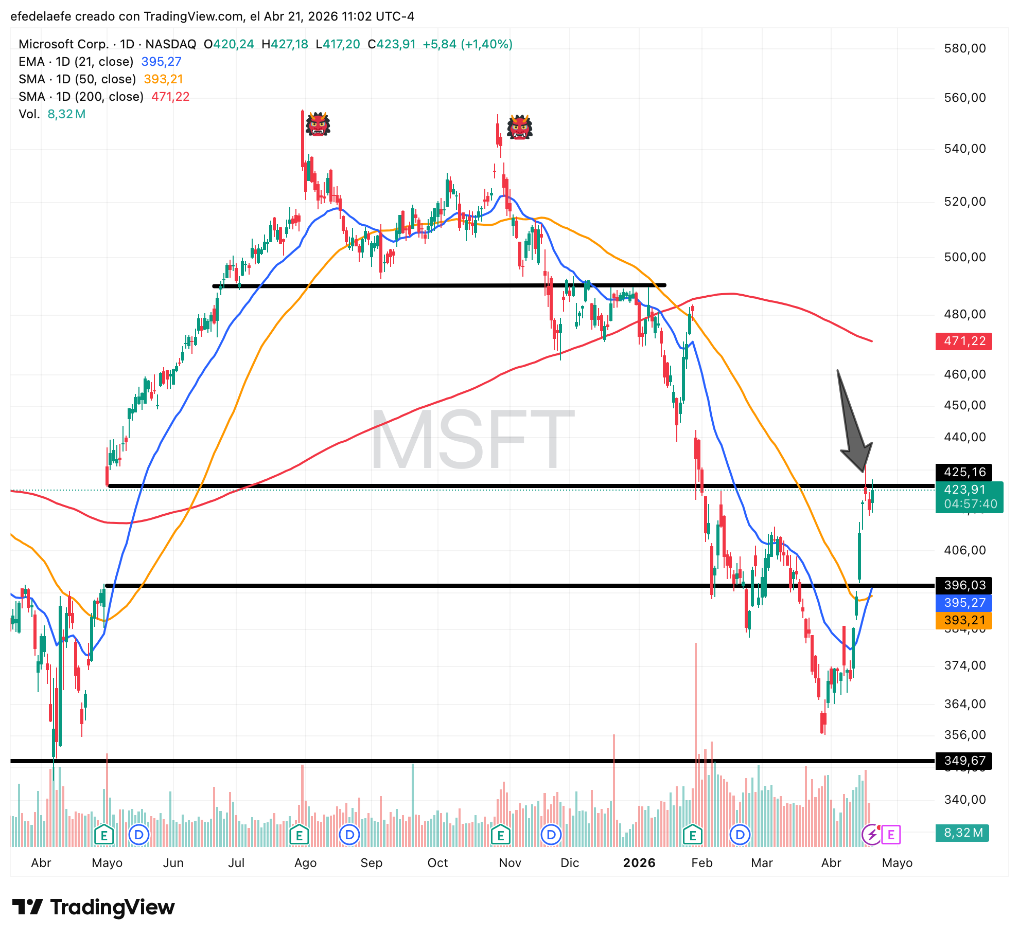 El soporte inmediato está en 396, donde confluyen EMA21 y SMA50. Perder ese nivel vuelve a abrir la puerta a los mÃnimos de marzo en 356. Por encima de 425, el siguiente objetivo es 480. Hasta que no recupere la SMA200, es un rebote dentro de una tendencia bajista. 🟡