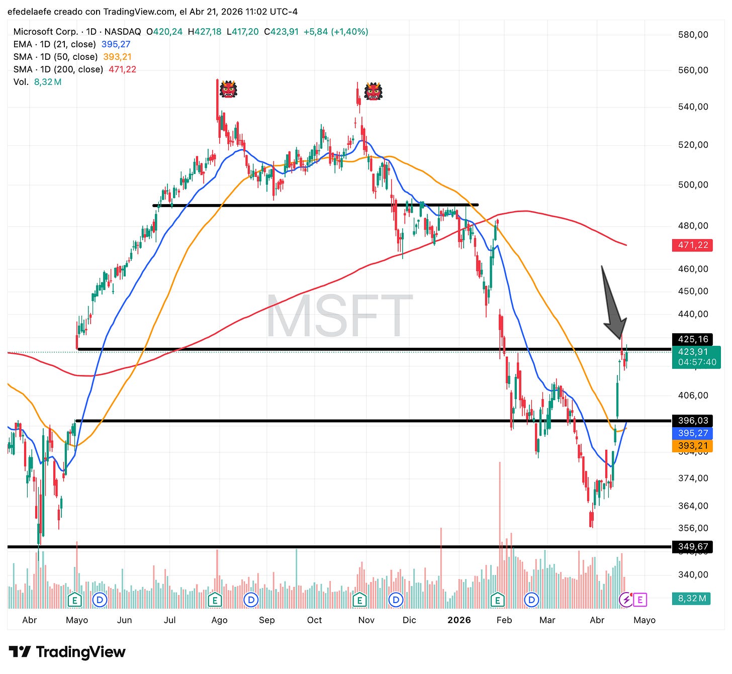 A corto plazo, el precio está pegado a la resistencia de 425. Cerrar por encima de ese nivel es el primer paso, pero no resuelve nada estructural: entre 425 y la SMA200 hay un 11% de recorrido lleno de niveles que frenarán el movimiento. 🔴
