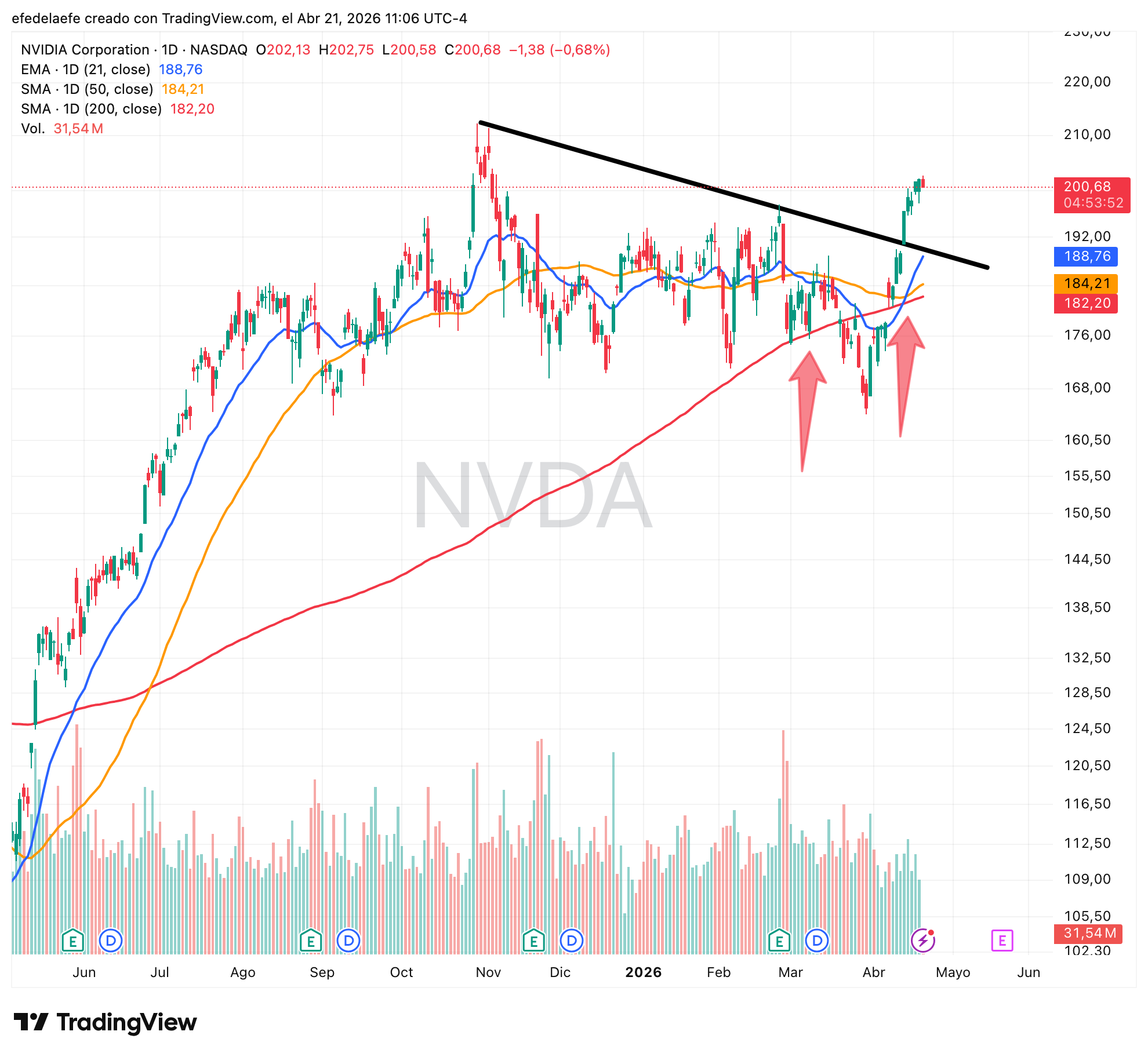 Las velas de capitulación de abril, con mÃnimos por debajo del soporte de 583 que se recuperaron en la misma sesión, son la mejor lectura del gráfico. El mercado probó ese nivel, no encontró vendedores y rebotó con fuerza. Eso es lo que tiene que hacer un suelo de corto plazo. 🟢