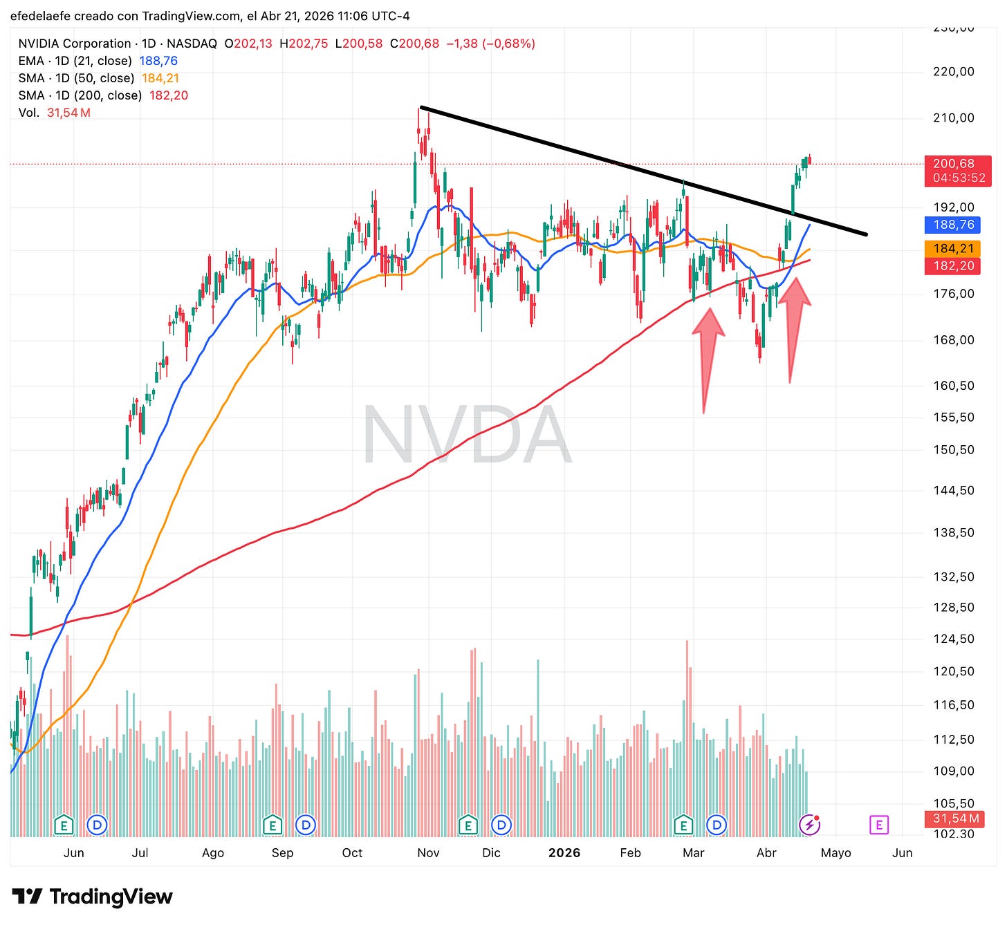 En los suelos ocurre lo contrario. El Ãndice toca fondo y rebota antes de que la mayorÃa de las acciones hayan resuelto su estructura. El Nasdaq ya hizo nuevos máximos históricos esta semana. NVIDIA está a un cierre de romper su rango de largo plazo. Pero Microsoft sigue un 11% por debajo de su SMA200 con pendiente bajista. Meta no ha recuperado la suya. Tesla acaba de reconquistar la EMA21 después de muchos intentos fallidos.
