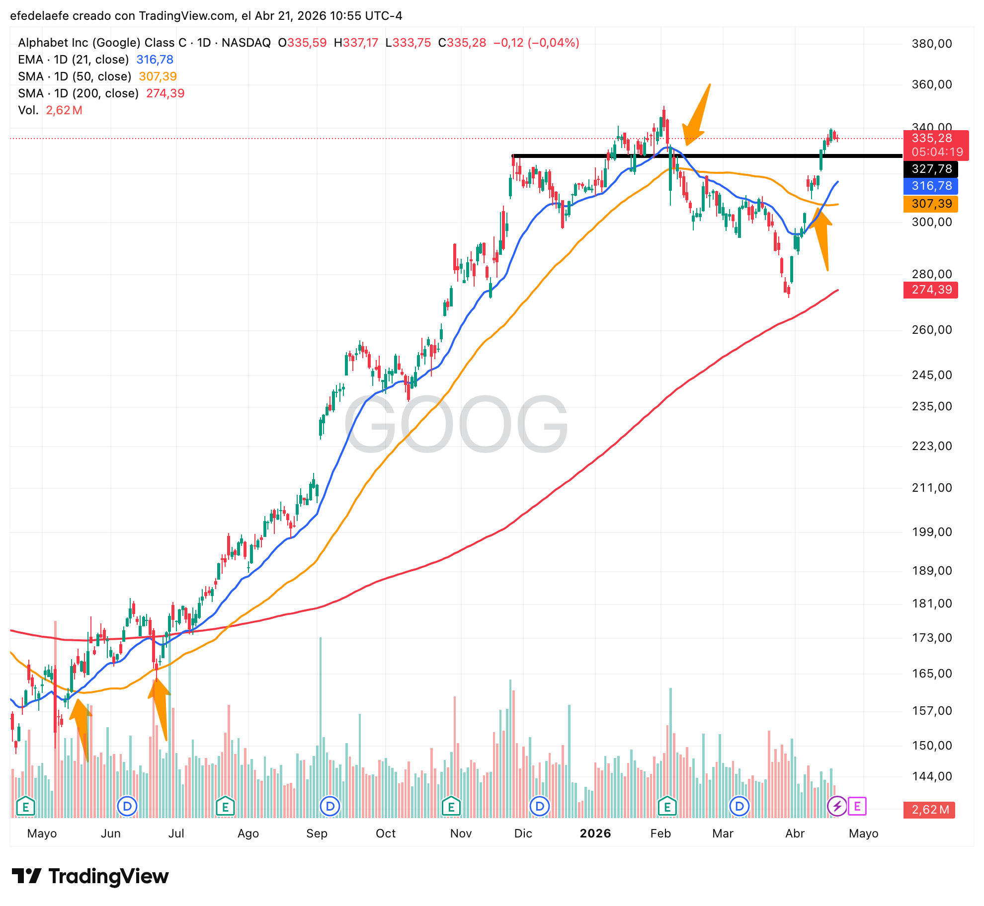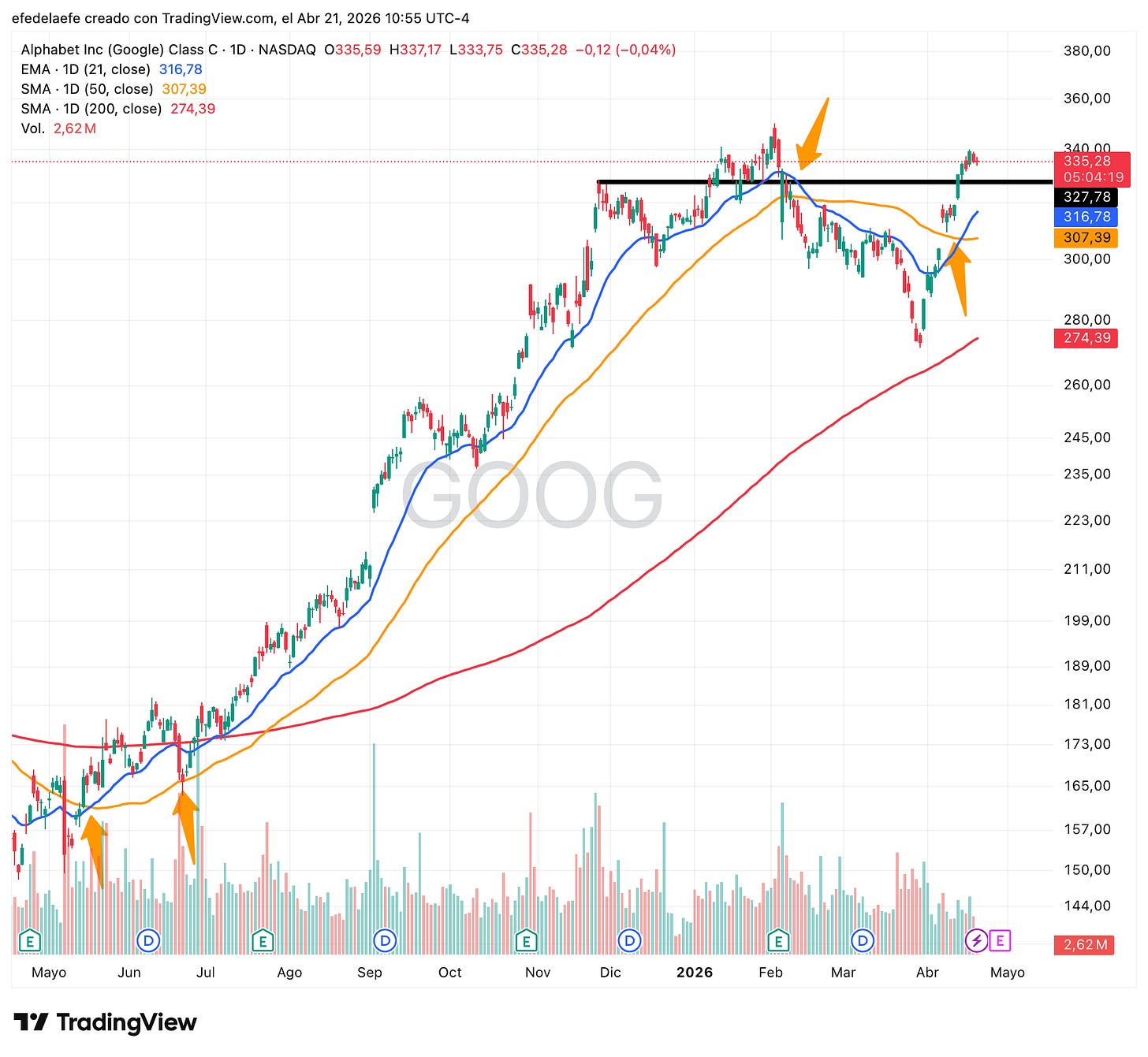 Después de caer casi un 22% desde máximos hasta tocar la SMA200 en 274, la recuperación ha sido ordenada y con fuerza. El precio rompió la resistencia en 328 y ahora cotiza por encima, con las tres medias alineadas al alza y separadas entre sÃ.