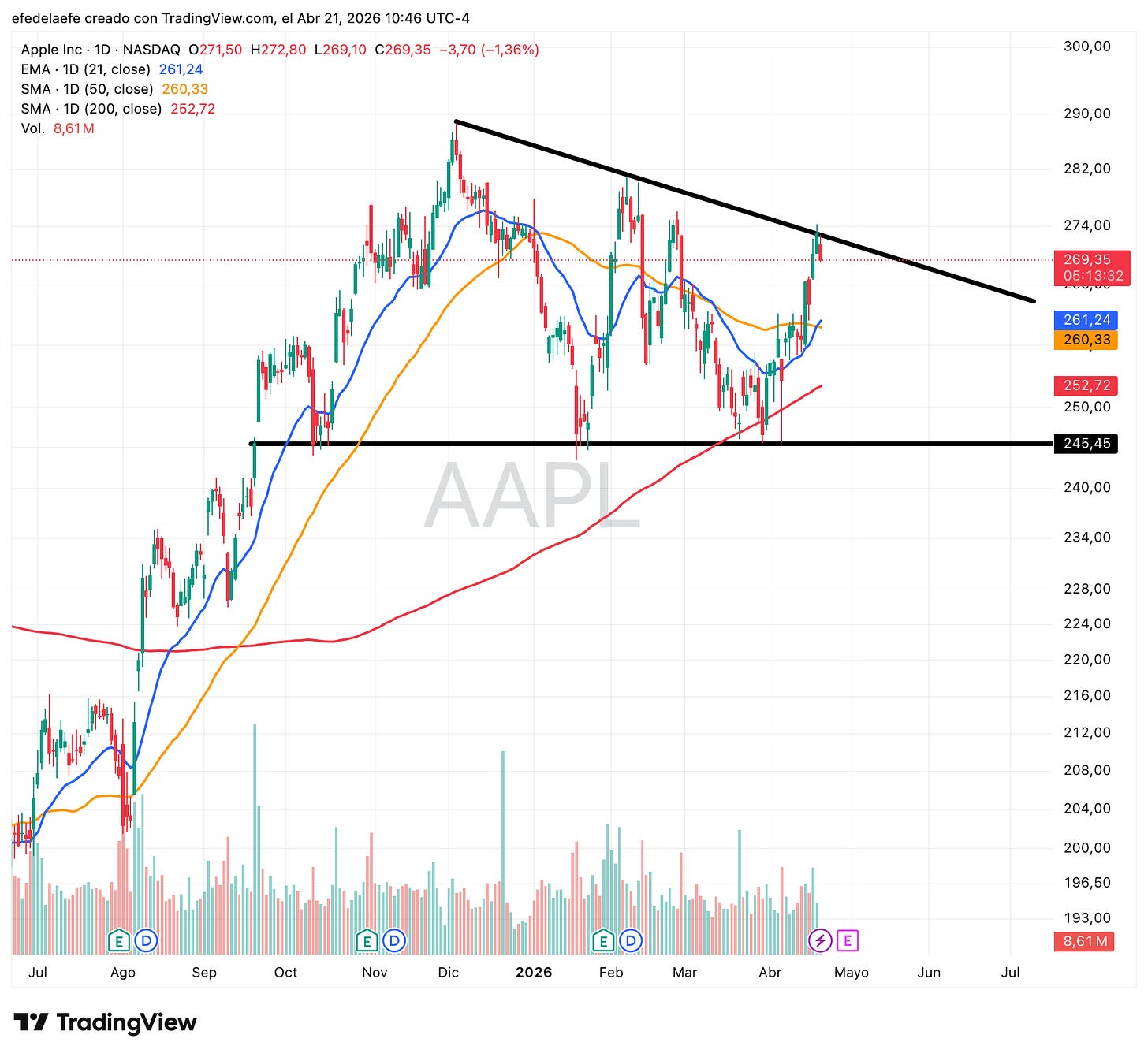 El precio lleva semanas comprimido en un triángulo alcista y hoy está tocando la directriz de resistencia en torno a 270-272. La ruptura no ha sido confirmada, necesita un cierre por encima con convicción.