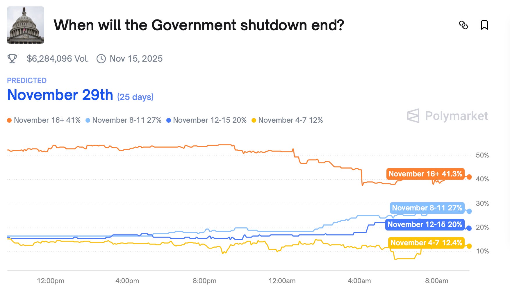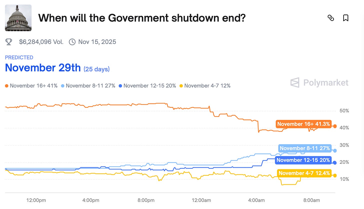 Respecto a cuando acabará este cierre parcial, los mercados de apuestas siguen indicando que puede durar más allá del día 16 de noviembre pero empiezan a aumentar las expectativas de una reapertura más próxima: