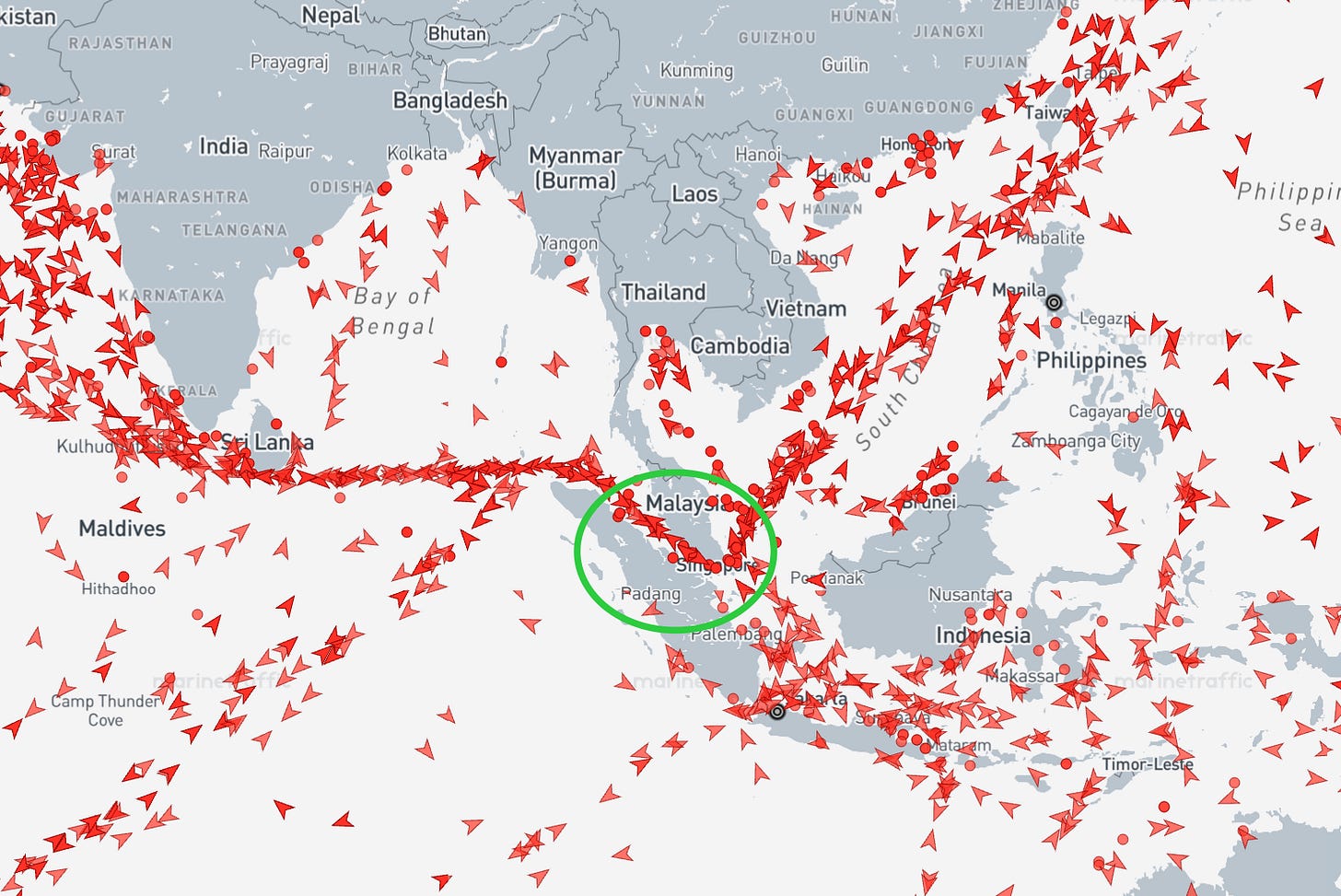 Pero el país aquí es Filipinas, que no controla el Estrecho de Malaca directamente sino las aproximaciones al Mar del Sur de China por donde los barcos deben pasar antes de llegar al estrecho.